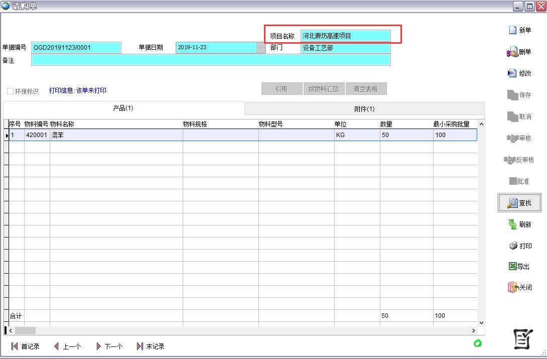 在請購單中填寫的項目名稱可以被轉入到其他單據中如采購單,詳見項目名稱