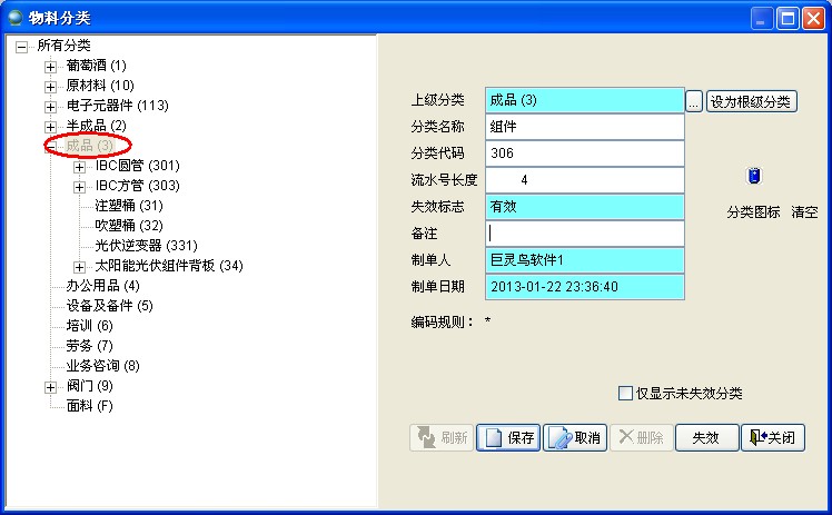 在左側(cè)樹狀圖中選中需添加下級分類的分類,如下圖,需在成品下添加下級分類組件。成品編號是以3開頭,組件編號是以306開頭,流水號4位,則最終生成的編碼從3060001到3069999。