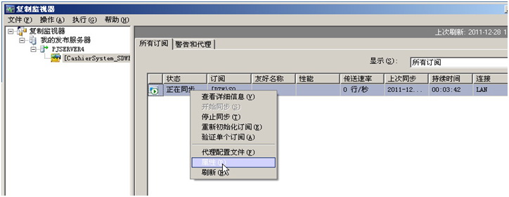 (2)展開“我的發(fā)布服務(wù)器”——>發(fā)布服務(wù)器機(jī)器名稱-——>發(fā)布名稱。在右側(cè)會(huì)看到訂閱服務(wù)器的狀態(tài)“正在同步”。右鍵,選擇“屬性”可以打開詳細(xì)說明。